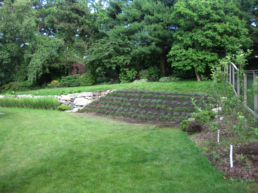 Phase 1 of the project was the regrading, terracing and planting of the large slope in the center of the yard and a cleanup along the back property line that included reorganization of existing perennials into larger groupings and the addition of a Smokebush, Japanese Cedar and four Viburnum. We decided to do these areas as they have a huge visual impact from the house, being visible from the living room, dining room, kitchen and the clients home office.