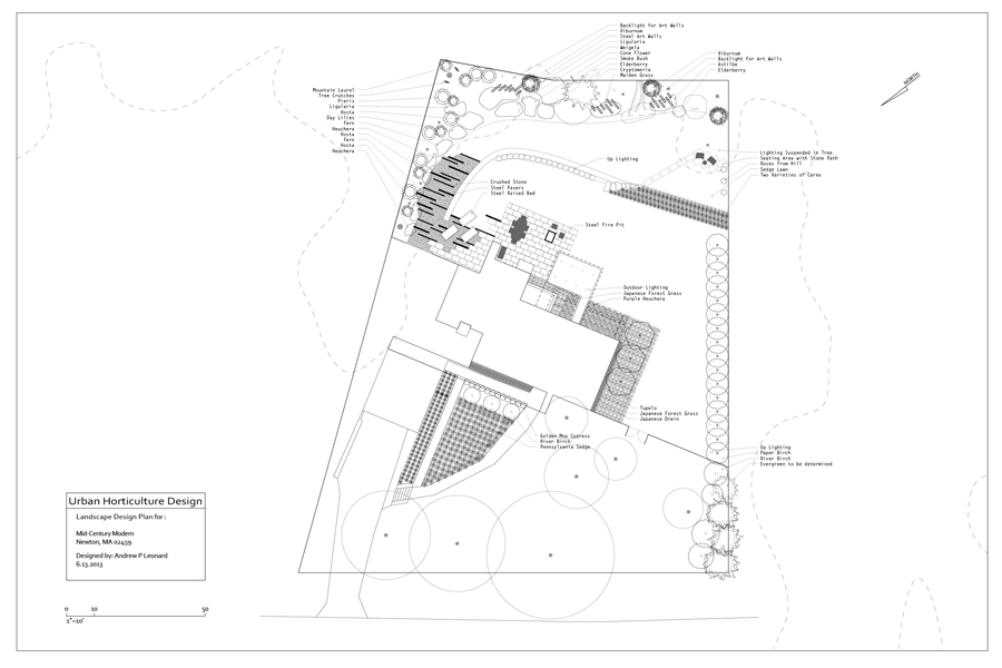 The Mid-Century Modern project began with a master plan of the entire site. The clients had purchased the property three years ago and had been renovating both inside and out. After working away on their own in the yard during that time they decided they needed a vision for the entire space that could be phased in over the coming years. The design for the landscape uses simple clean lines in the main gardens around the house to compliment the clean lines of the architecture while the edge of the property has a stylish yet naturalistic feeling to blend with the adjoining properties, making the entire space seem larger.