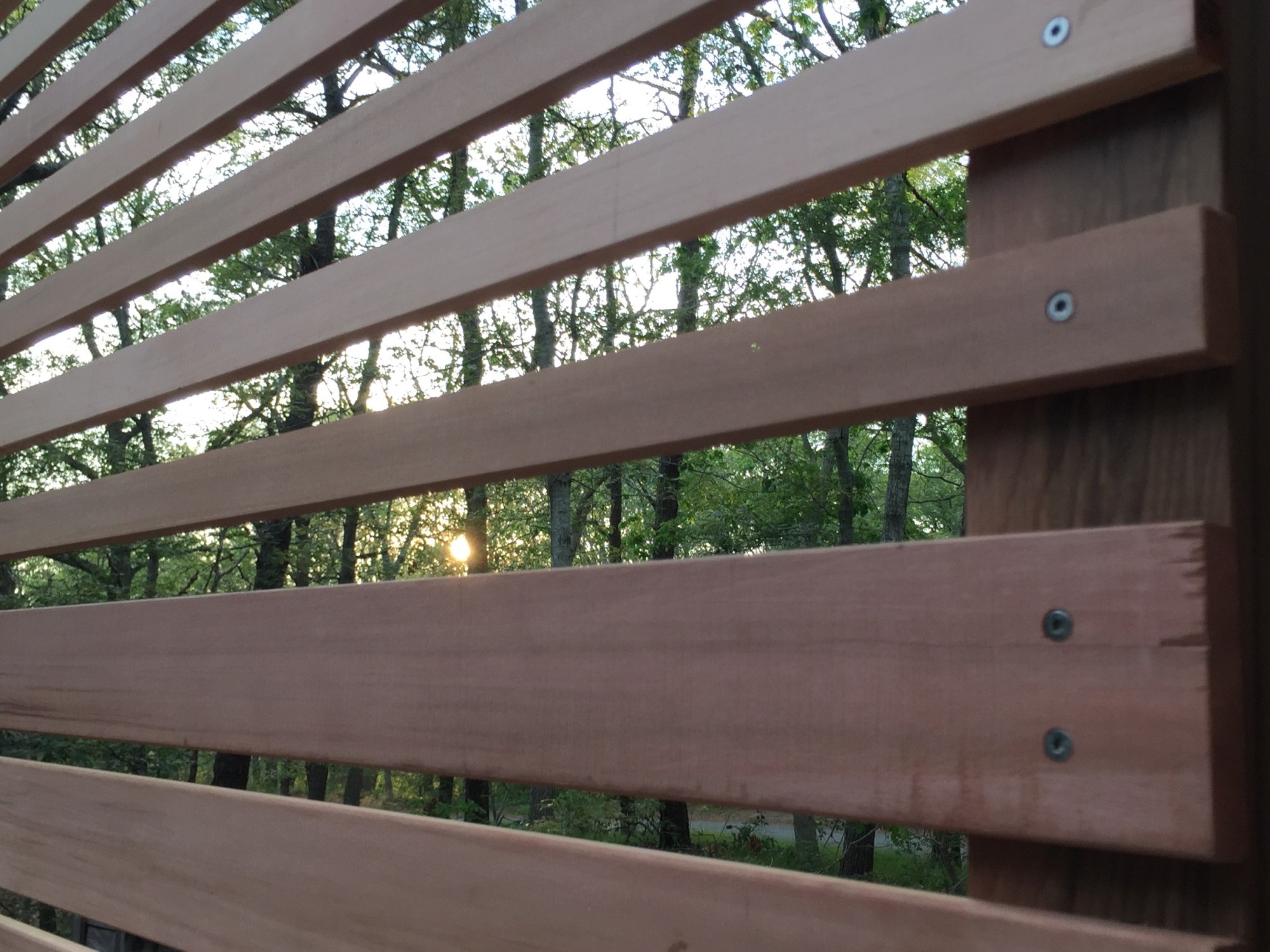 These custom cedar screens were built for a clients summer home in Wellfleet, MA. The client wanted some screening to add a bit more privacy from the road and block the view to the parked cars from the deck where the family spends most of it’s time while at the house. We designed these screens to in and amongst the existing landscape that is a traditional Cape Cod Scrub Oak community. The used varying spacing and prominent hardware to create a graphic yet open deign that both worked within and stood out from the landscape.