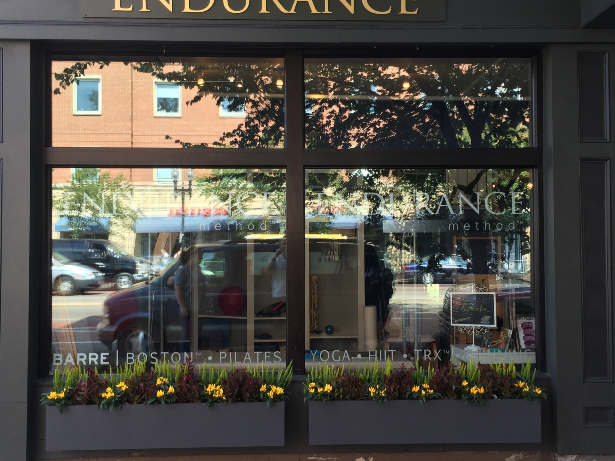 Custom window boxes were built for the storefront of Endurance Pilates and Yoga Studio in Boston’s South End. The boxes were custom built for the five foot wide windows, they are constructed of PVC so that decay will never be an issue as it is with any wooden box. The boxes were planted with bright and funky fall annuals to accentuate and draw attention to the studio.