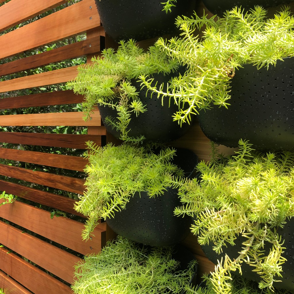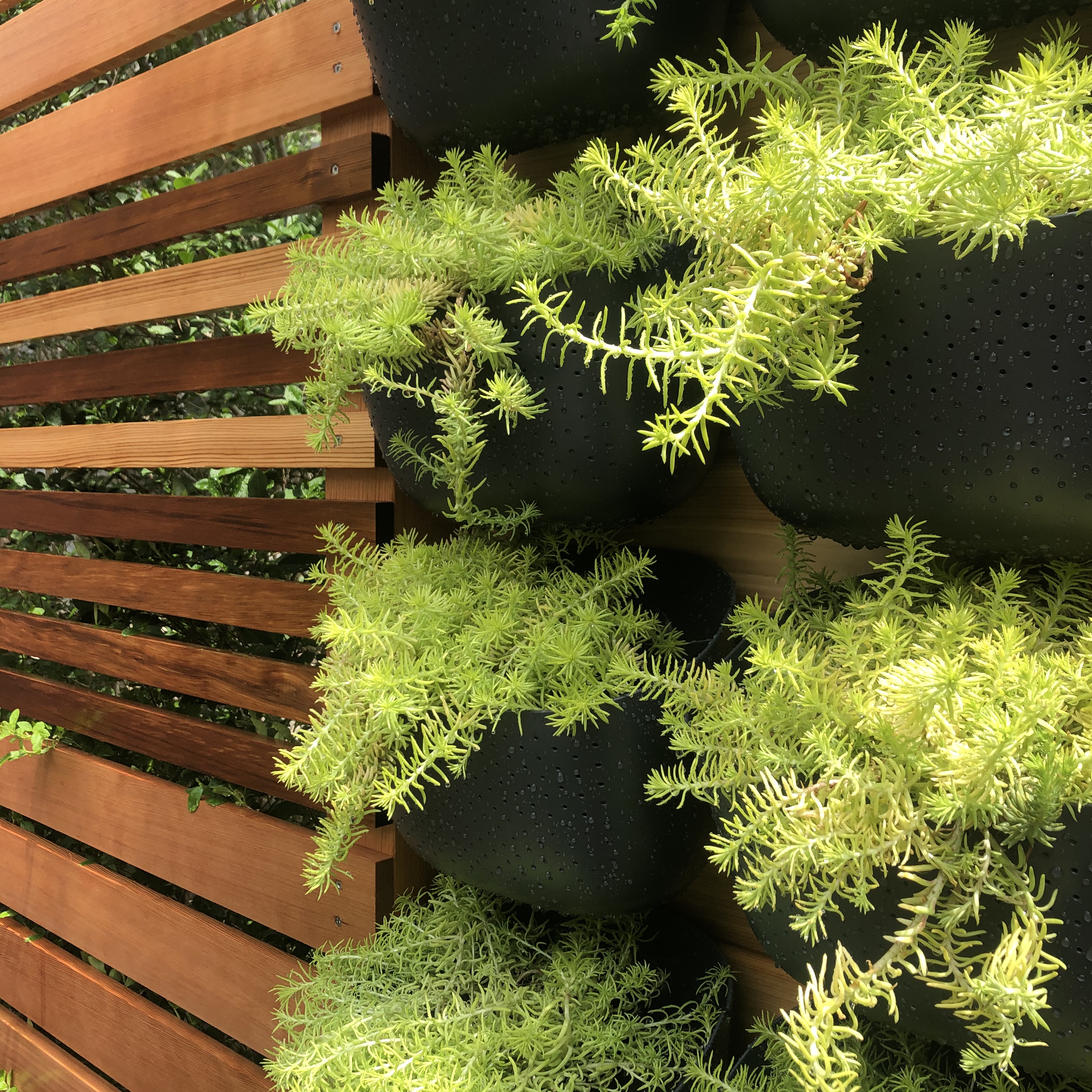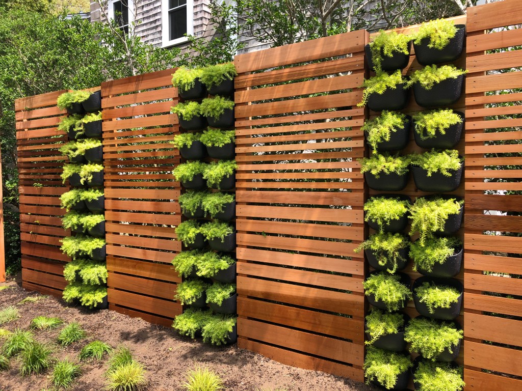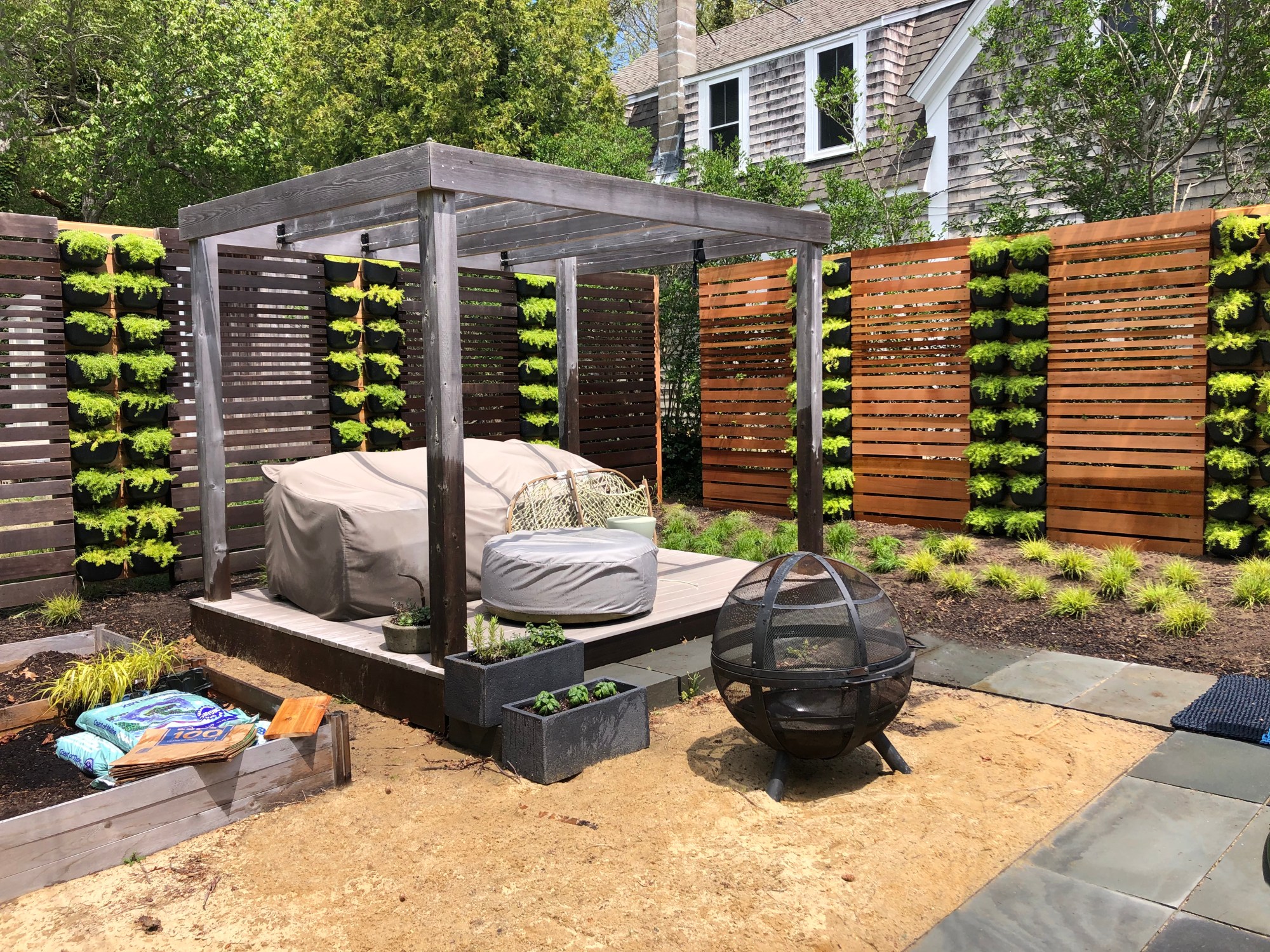 This is an update of the Provincetown back yard that we designed and installed in 2019. For this portion of the project additional custom cedar screens were added to provide more privacy. The space between the screens was filled in with Wally Grow green wall pockets filled with Sedum Angelina. We also refreshed the landscape with new ornamental grasses to finish out the beach aesthetic.