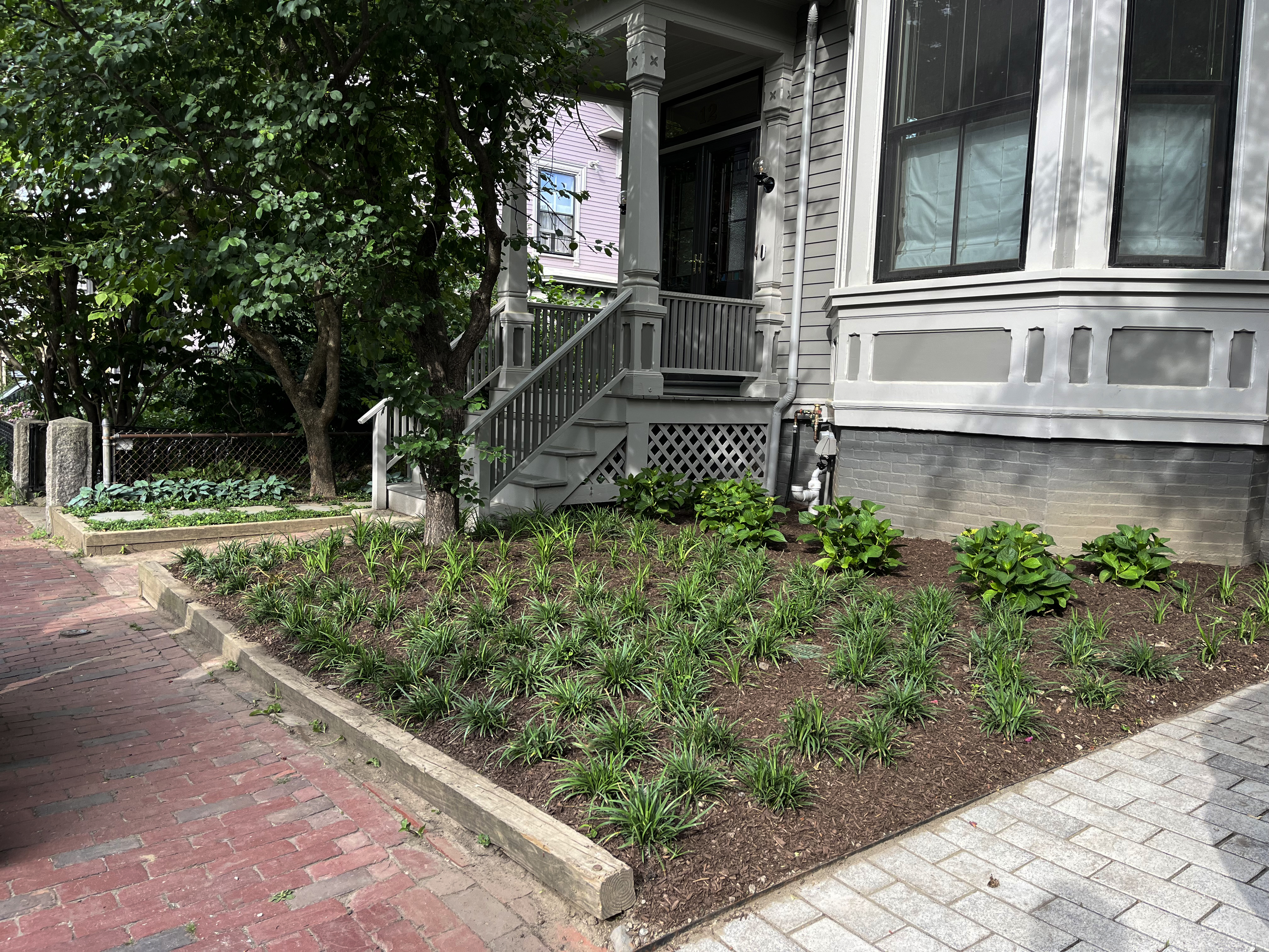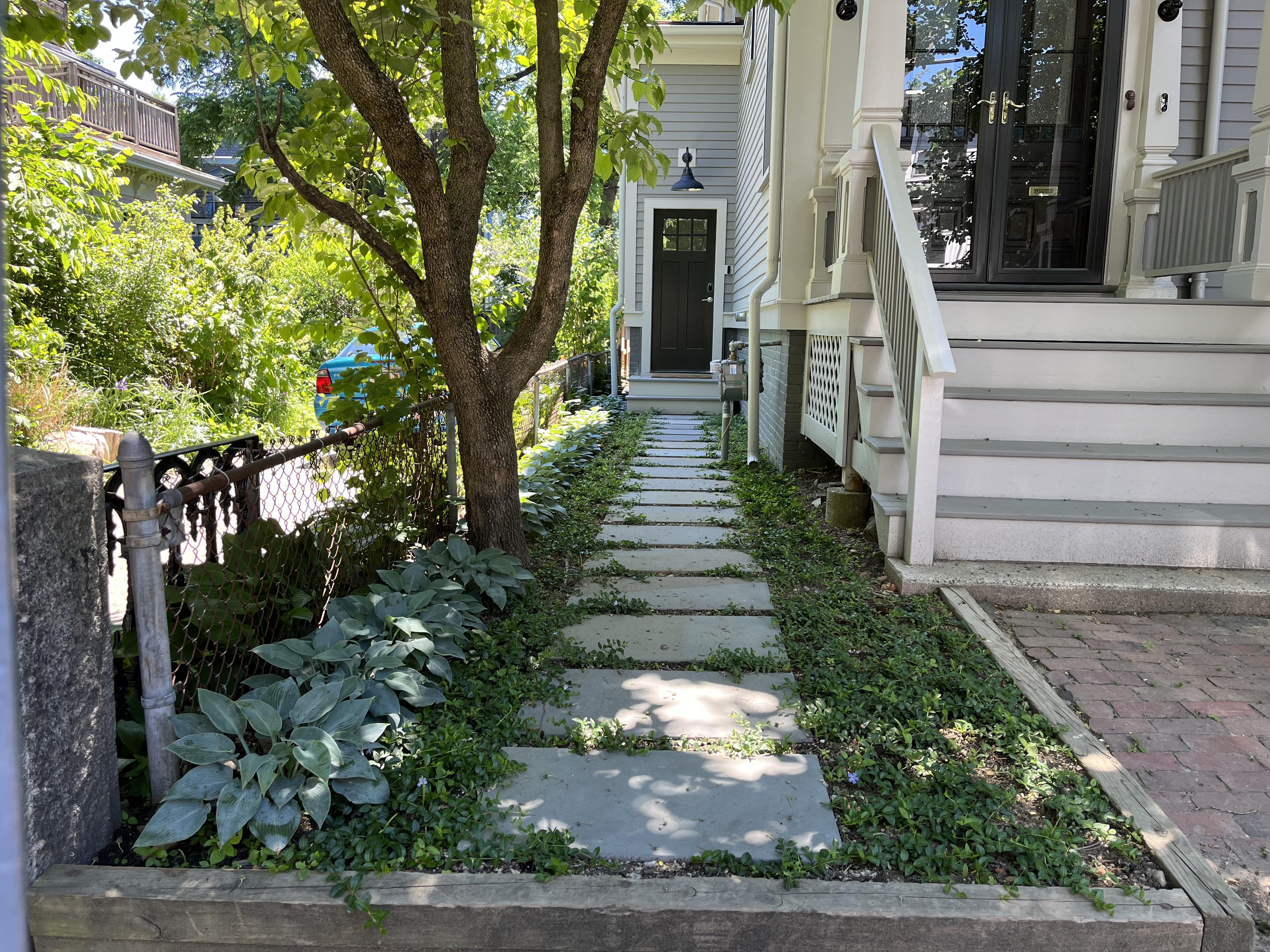 The front and side was planted as a simple garden. The garden to the right of the front entry was planted with Hydrangea along the house, filling the space in front with Liriope. To the left of the entry we installed a bluestone pathway to the side door, vinca was planted throughout the path to create the feel of a “garden path”. A row of Blue Halcyon Hosta was planted along the neighboring property line to finish out the clean design.