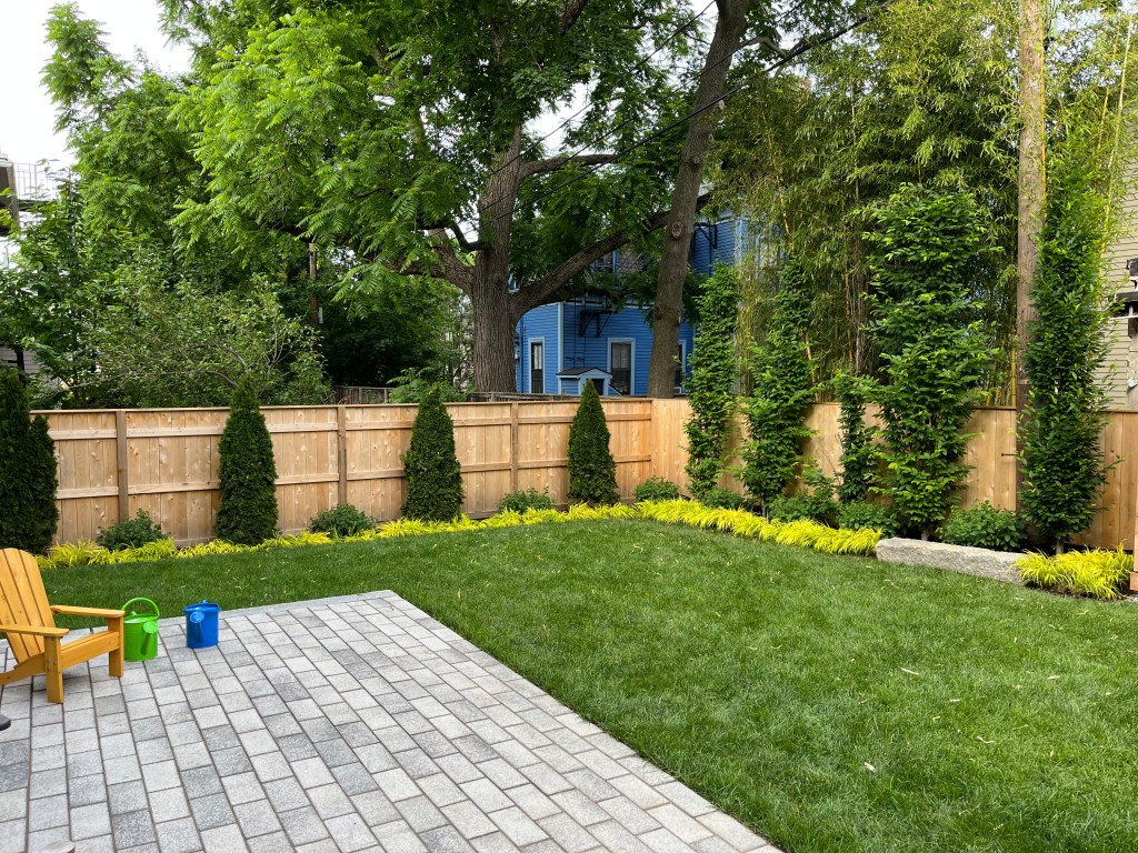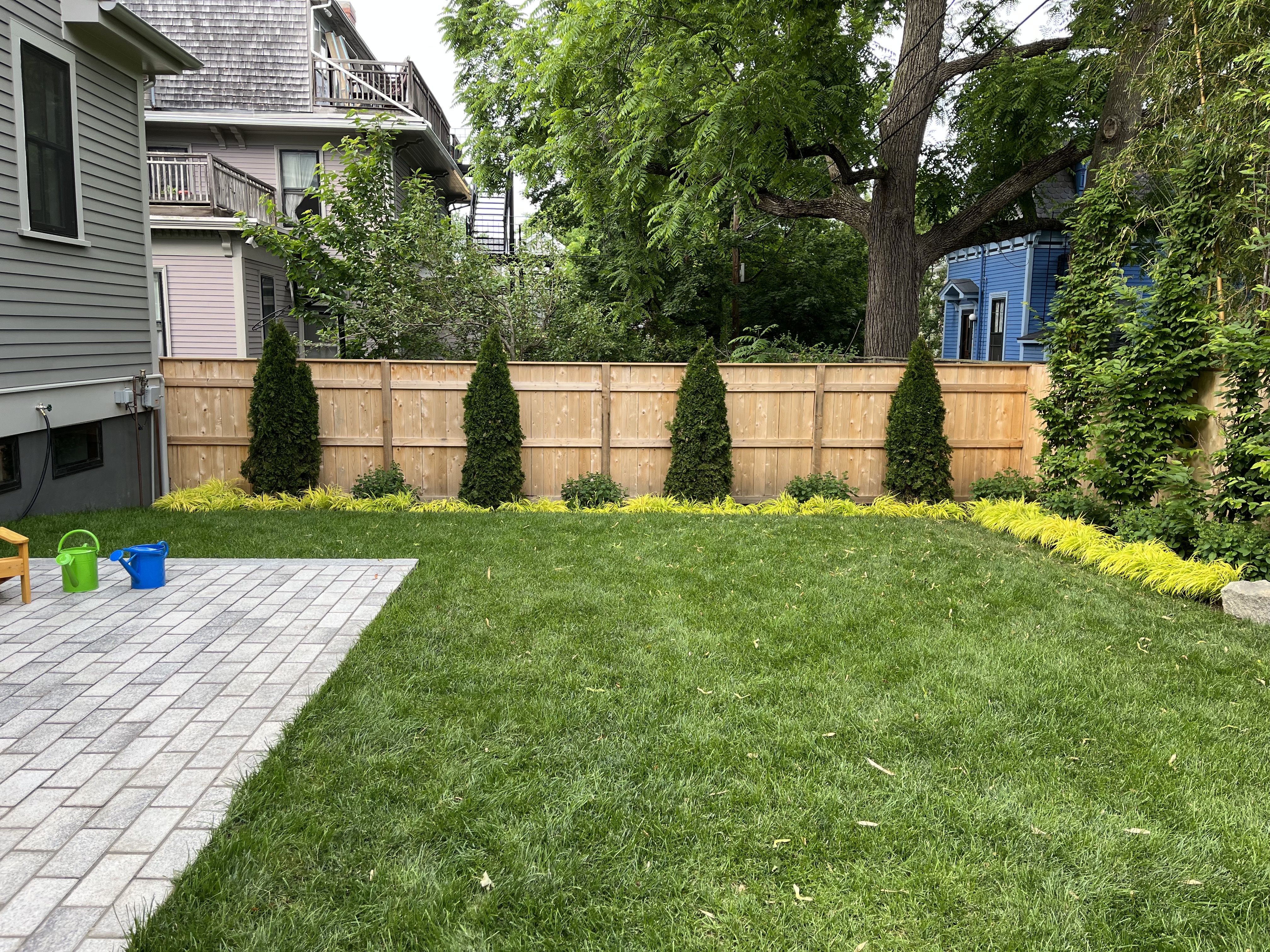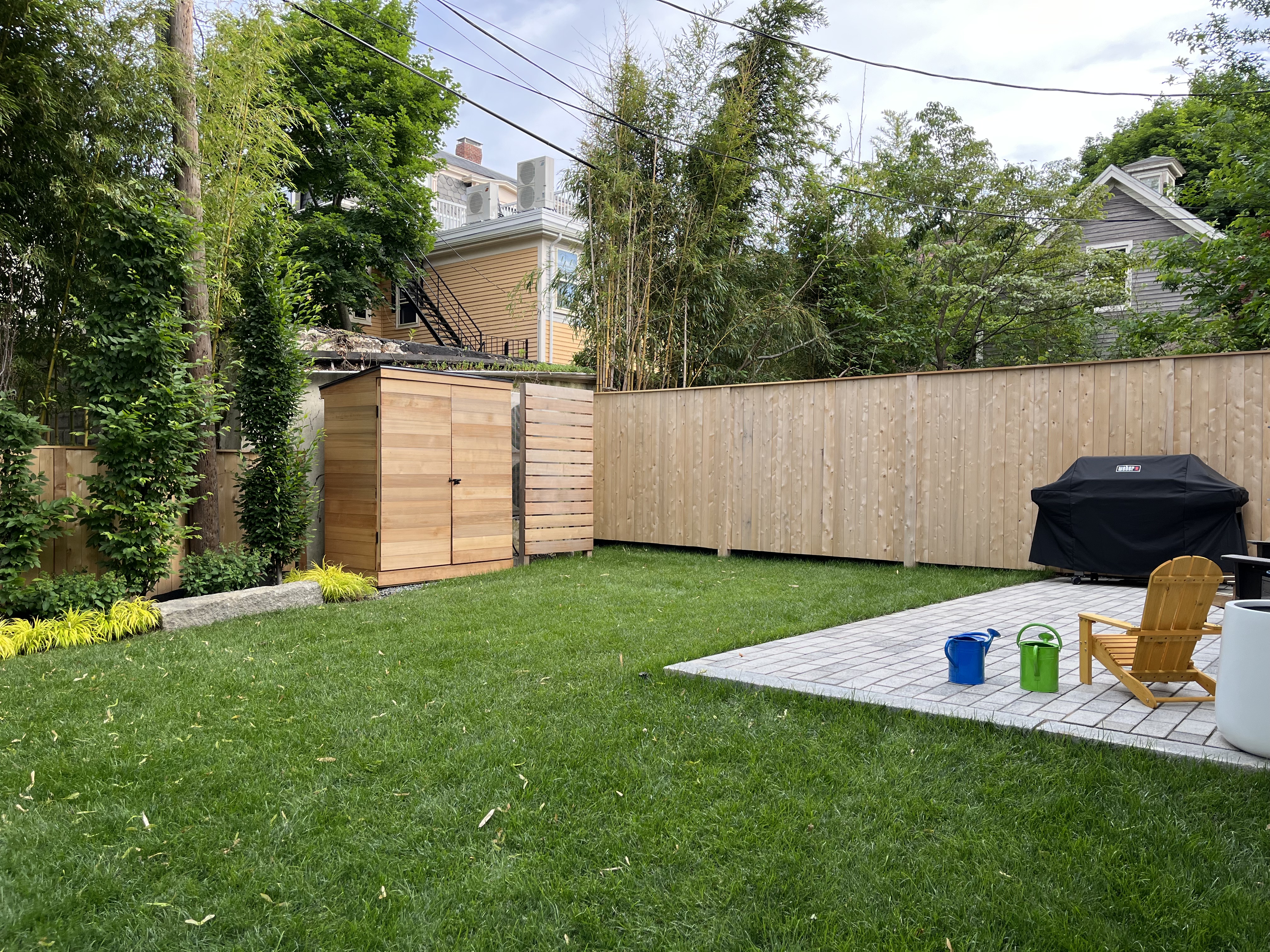This project was a complete redo of the landscape as part of the renovation of a residence in Cambridge. The clients were looking for a clean design that will functional for their growing for years to come. When we began, the back yard was completely overgrown with bamboo. To start we excavated over two feet of soil to eliminate the root mass and reclaim the yard space. We then came back in with clean lines and simple plantings splitting the space between the patio that wraps the house becoming the driveway and a lawn space for the kids to play. We also built a custom shed and AC screen to finish the space.